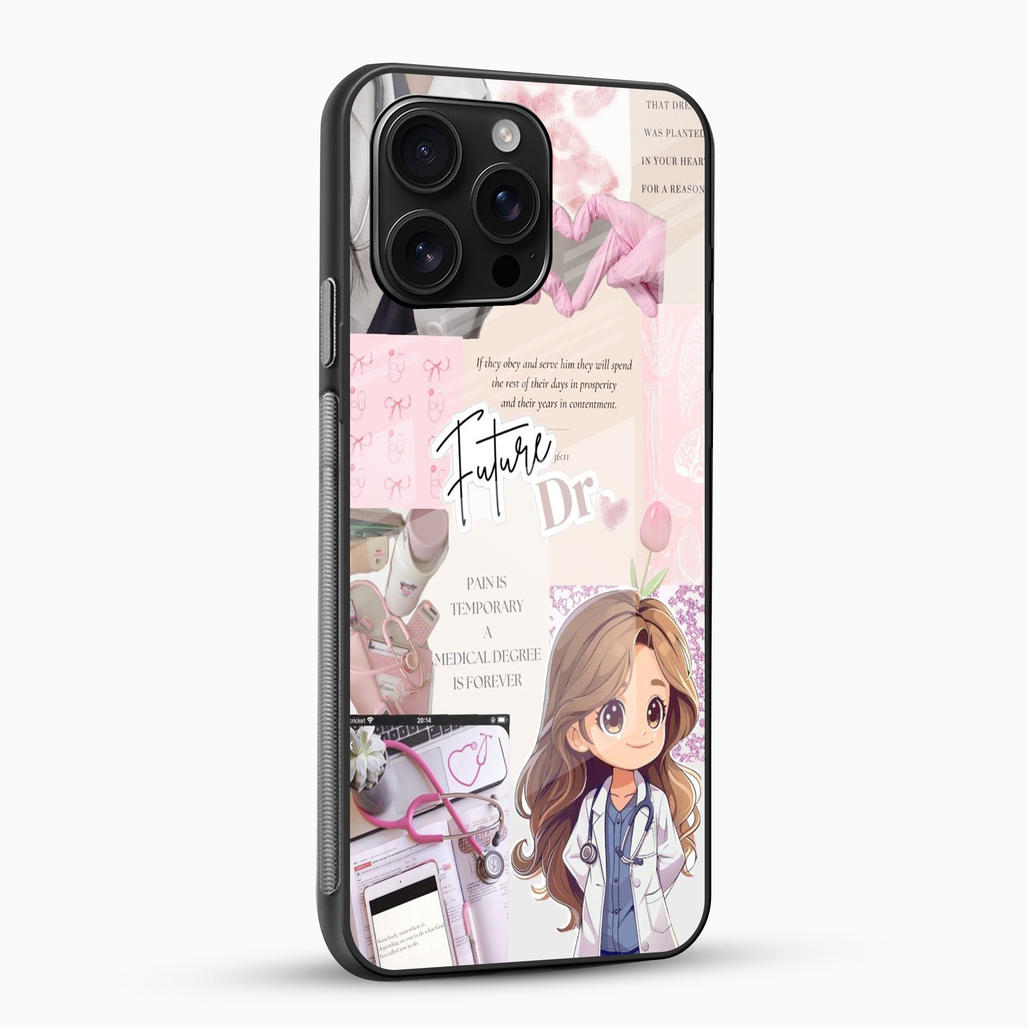 The Future Doctor Aesthetic Glass Mobile Cover features a soft pastel collage inspired by medical dreams and cute aesthetic vibes. With stethoscope elements, study quotes, and an adorable doctor character illustration, this design is perfect for medical students, nurses, and healthcare lovers who want a stylish yet meaningful mobile cover.